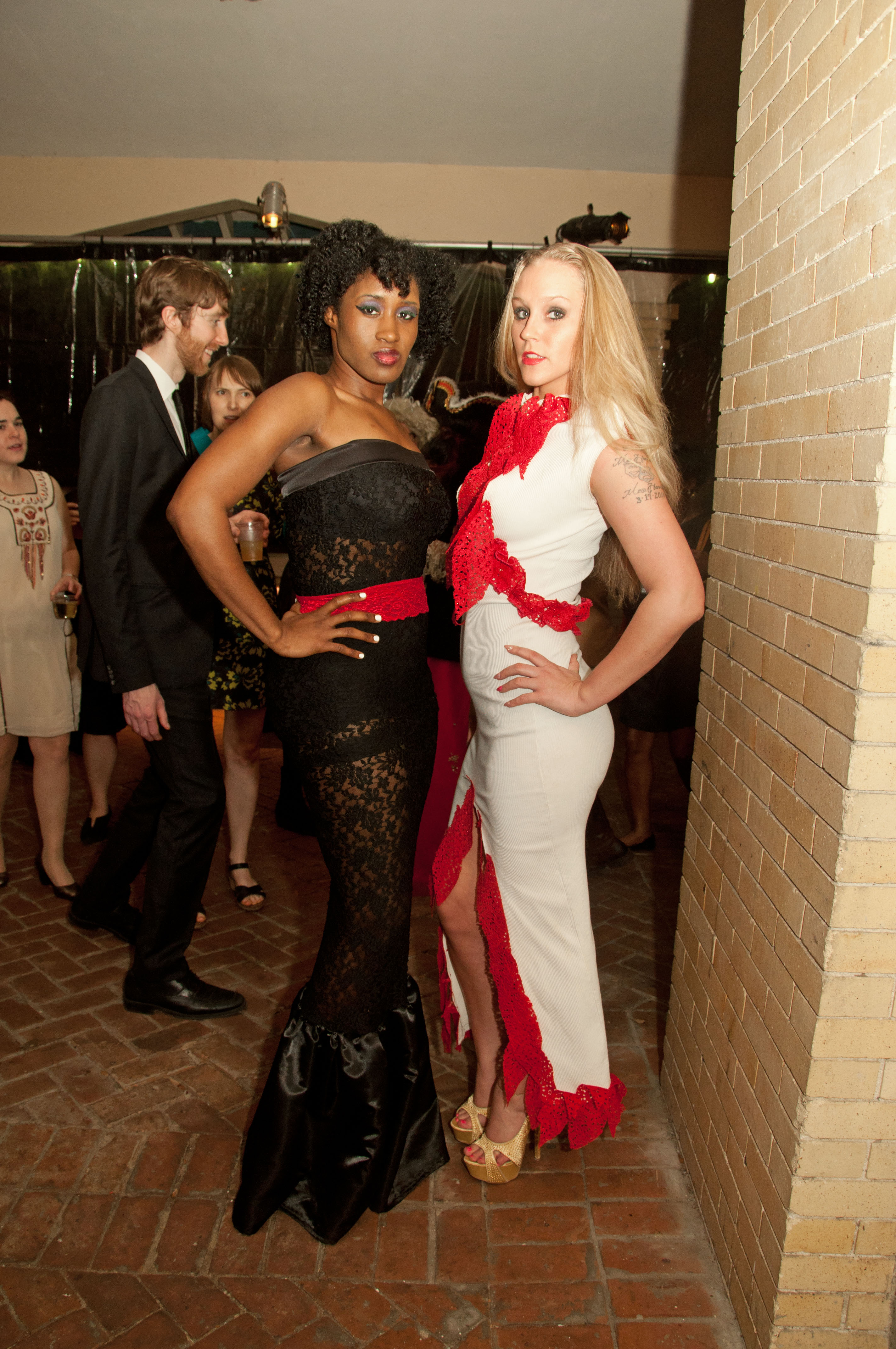 (1) Models in fashions by Carolina Gallop (left) and CoLab: Elizabeth Shannon & Kate McNee (right)