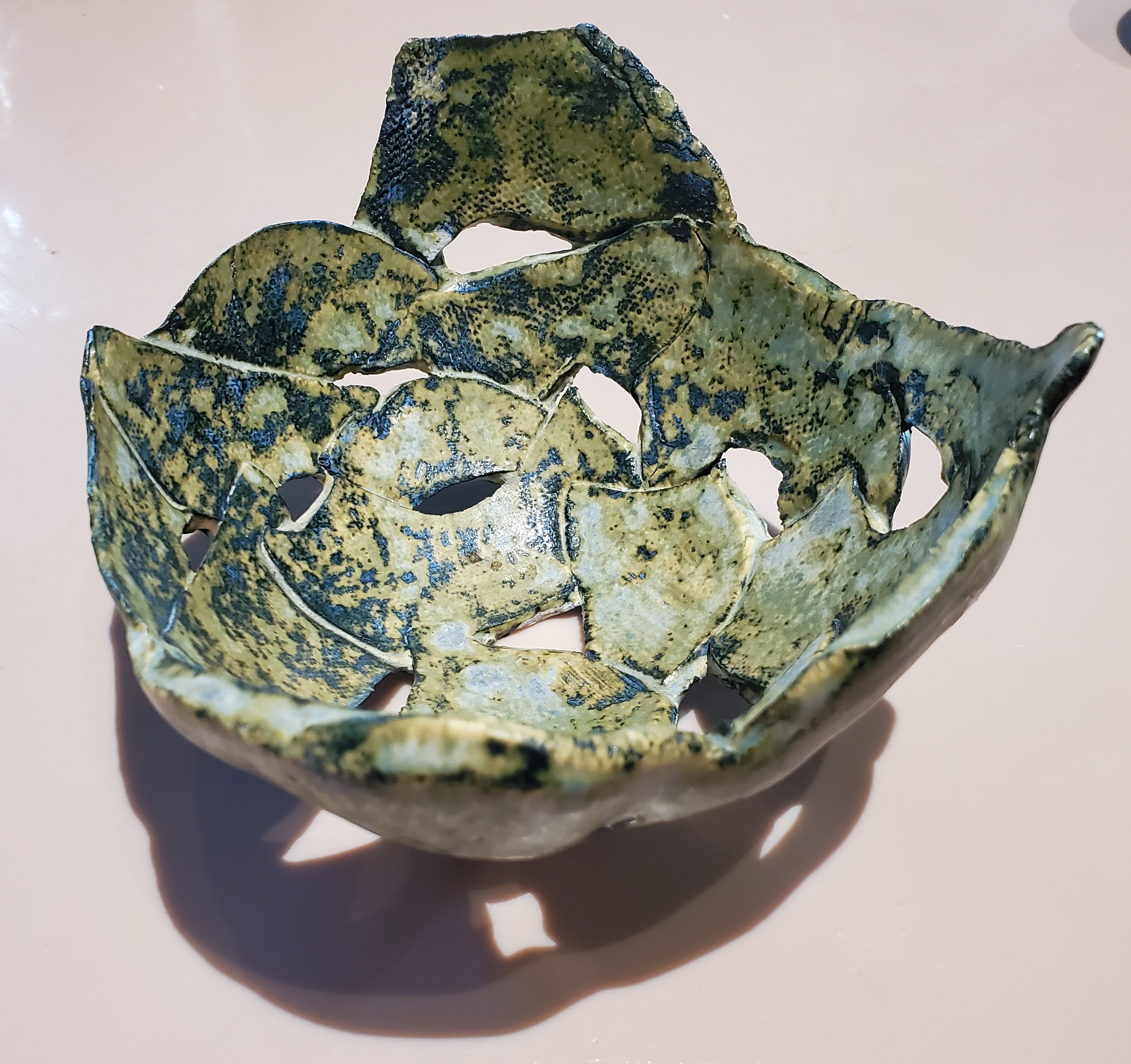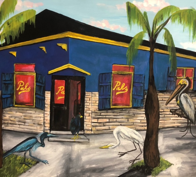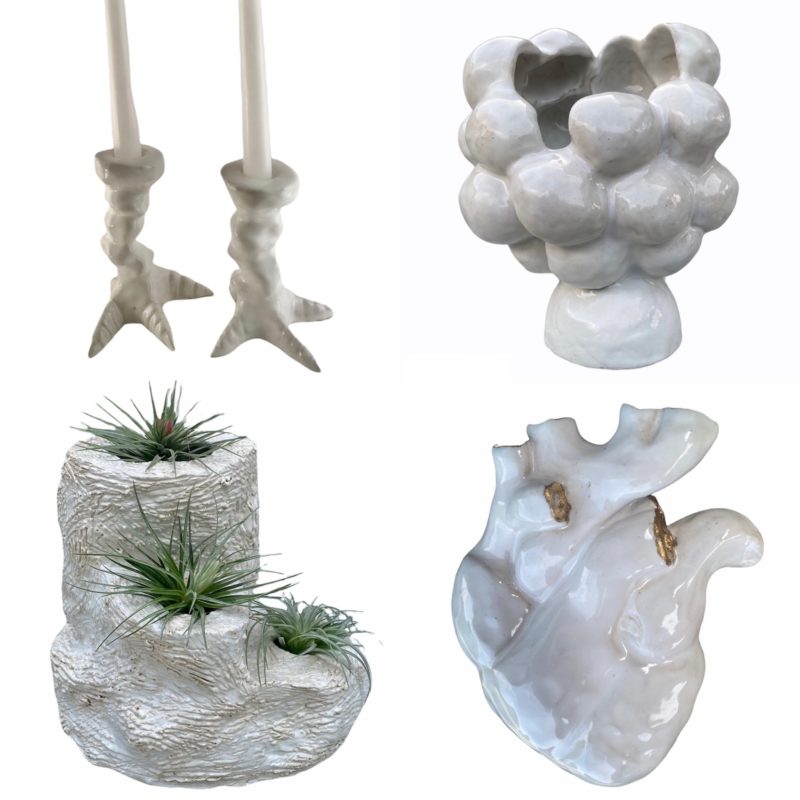 Natalie Toth: “Pilate” (Found materials, enamel paint on board, 15″x13″); “Lucy Window” (Found materials, enamel paint on found window screen, 40″x30″); “Open Sesame” (Found materials, enamel paint on wooden slat board, 25″x25″). Visit her website to purchase.Sally Heller: “Home Sweet Home” (Paint, sequins, print on canvas mounted on 1 inch foam, approx 12″ wide). Visit sallyheller.com or @sallyheller to purchase.Sandra Pulitzer: Glazed ceramic basket. Visit @sandrapulitzer to purchase.Matthew Foreman: Visit @mattforemanart to commission a portrait.Karen Gadbois: Vintage silk pillowcases. Visit karengadbois.com or @karengadbois to purchase.Errol Barron: “Floodwall” (10″x13″). Visit octaviaartgallery.com or @octavia_art_gallery to purchase.Elizabeth Shannon: “Circle With Horn” (Wood form and cow horn, 13″x13″x20″). Contact her at foundobject@cox.net or 504 722 4931 to purchase.