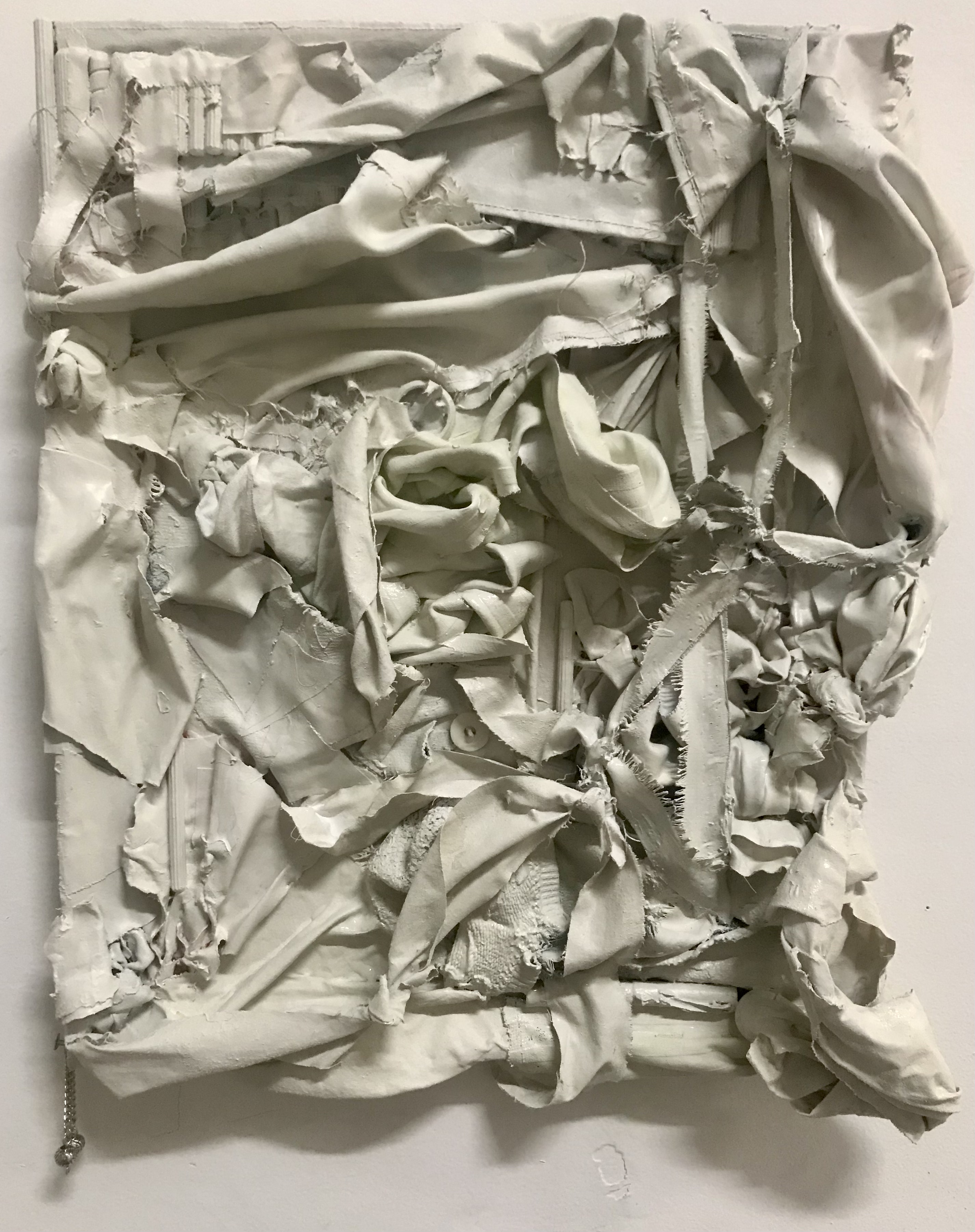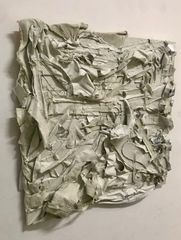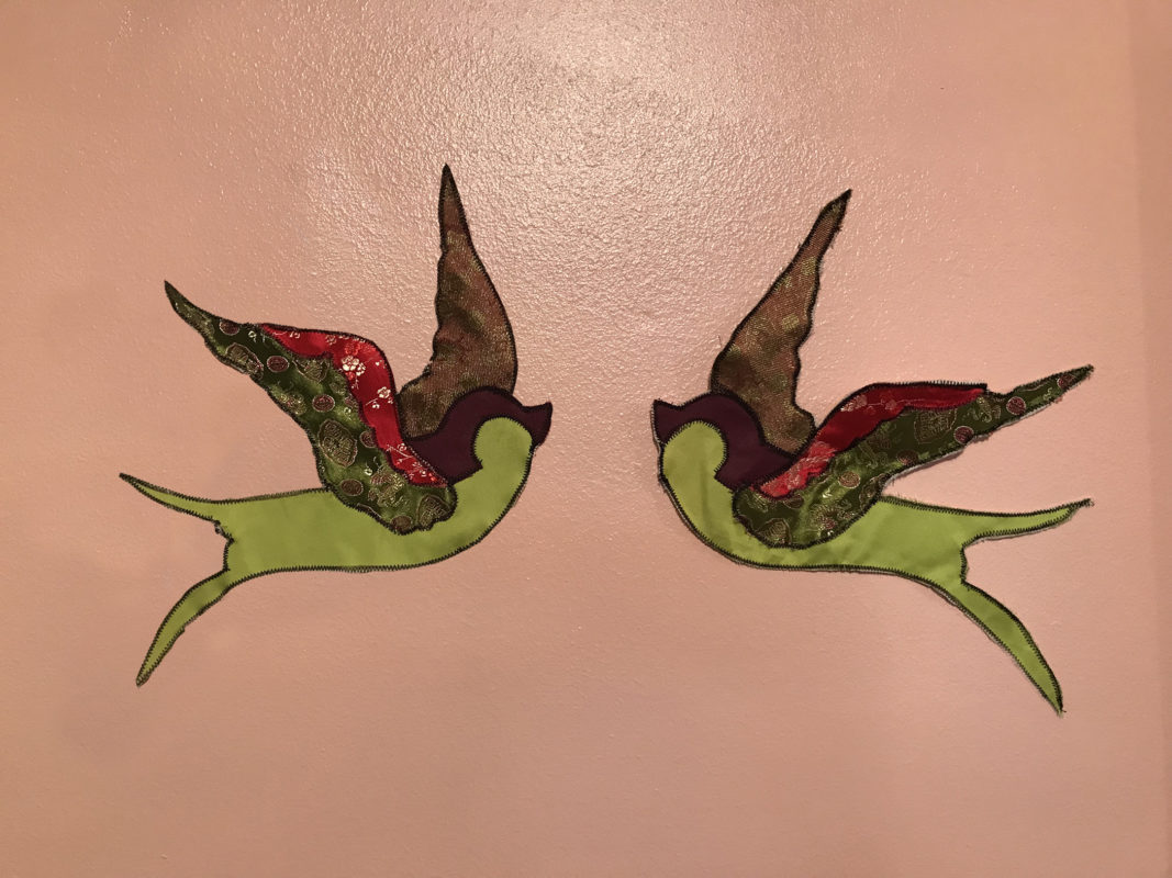 Susan Gisleson: “Tattoos as Souvenir” (Fabric scraps, thread, rhinestones; $125/each or $200 for a pair). Visit susangisleson.com to purchase.Gina Phillips: “La Beluse” (Oil on primed paper, framed, 20.1″ x 32.8″, $3000). Visit ginaphillips.org or @ginarphillips to purchase.Michel Varisco: “Embodiment”. Visit michelvarisco.com or @michelvarisco to purchase.